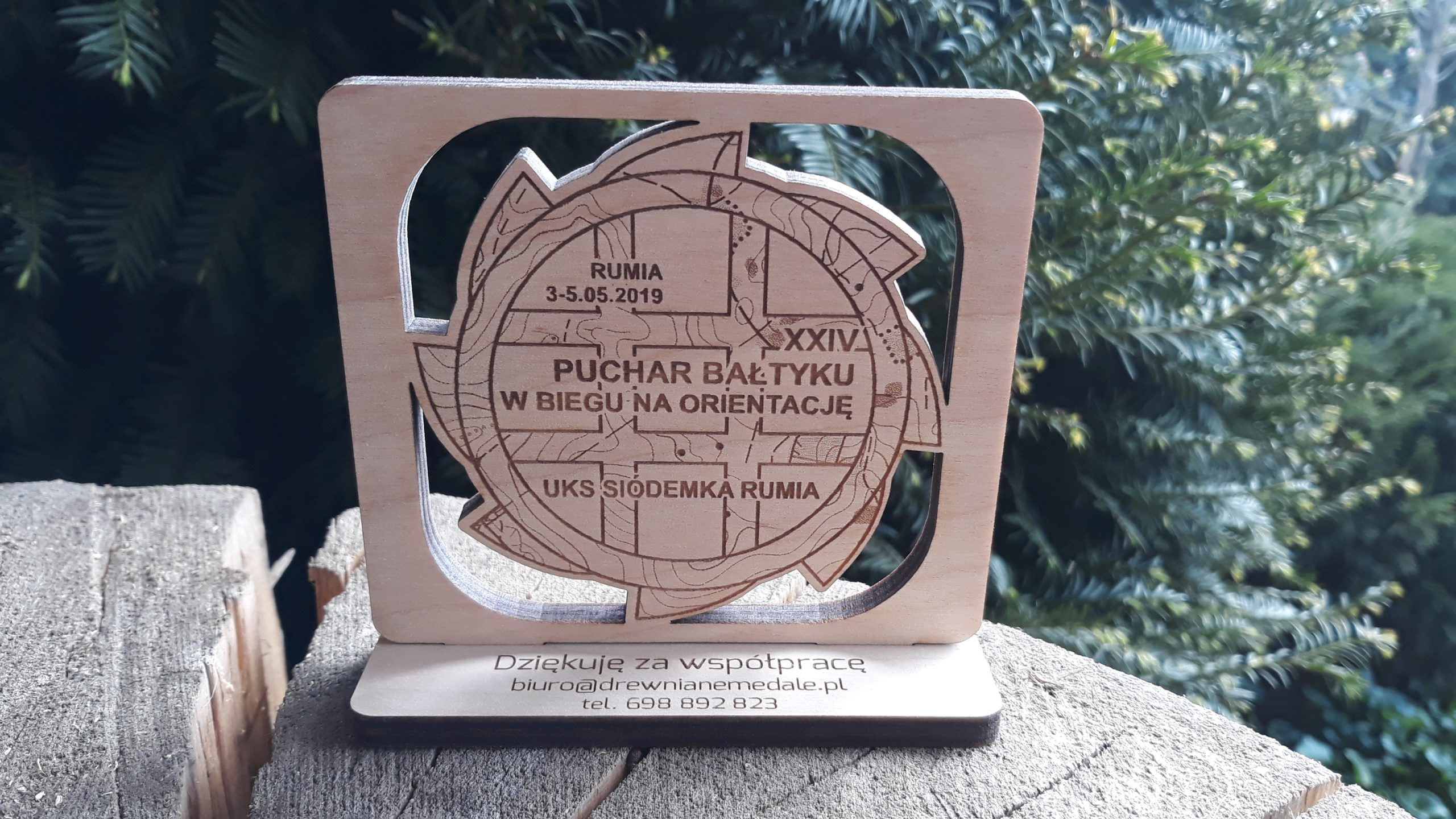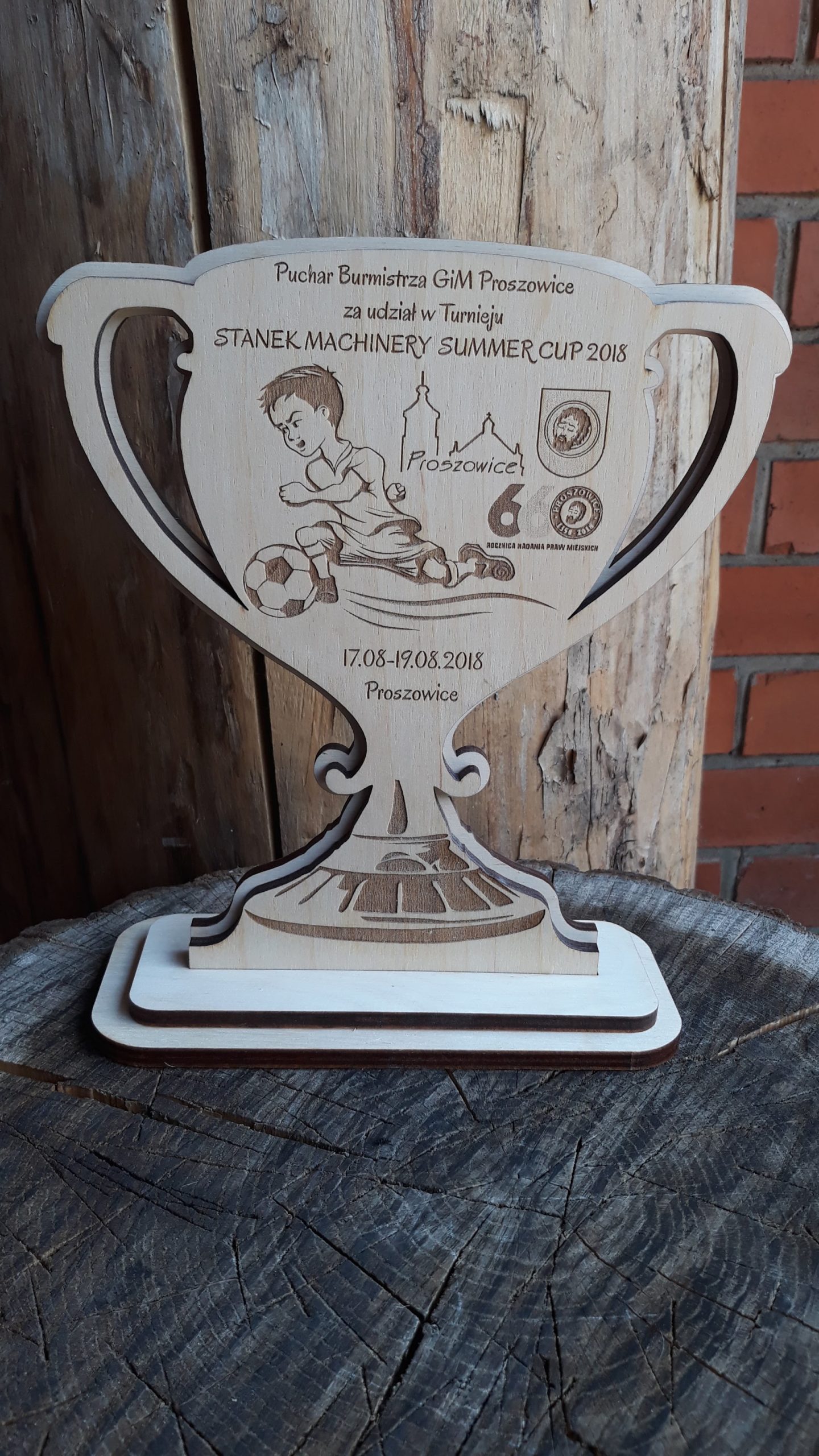 Drewniane statuetki, drewniane puchary i drewniane medale.
